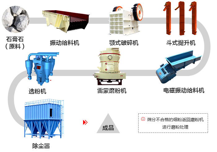 大塊的石膏石原料在給料機的作用下,并均勻、連續(xù)的送入顎式破碎機進行粗碎加工,破碎后的石膏石在斗式提升機的作用下被送入料倉,之后由電磁振動給料機均勻、定量的送到雷蒙磨粉機進行磨粉加工,經(jīng)磨粉后的粉末在鼓風(fēng)機的租用下吹向分析機進行分選,分選后的物料由廣島輸送到大旋風(fēng)收粉器,后經(jīng)出料口輸出。